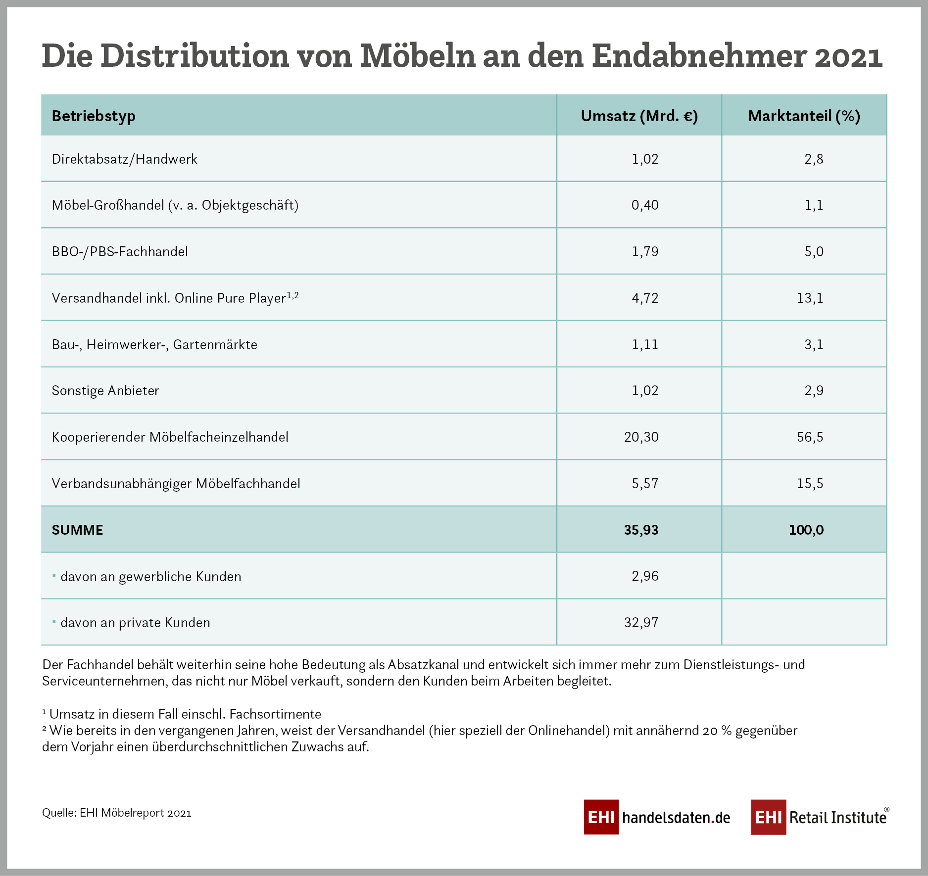 Die jährliche Möbelmarkt-Studie des EHI wird im Auftrag des ZGV Mittelstandverbundes erstellt. Sekundärquellen dritter Marktforschungsinstitute werden dabei zu einer Gesamtanalyse zu Marktvolumen und Distributionsstruktur des deutschen Möbelhandels zusammengefasst.