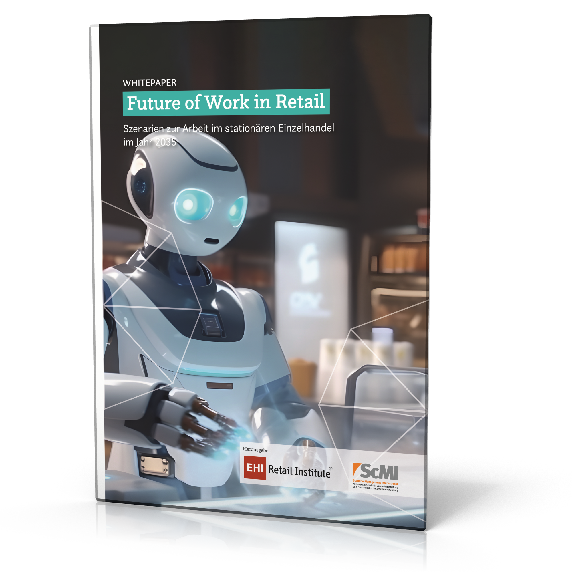 Neue Geschäftsmodelle, technologische und wirtschaftliche Entwicklungen sowie der Fachkräftemangel sind nur einige Einflussfaktoren, die die Arbeitswelt im stationären Einzelhandel massiv beeinflussen. Das Personalwesen im Handel steht vor großen Herausforderungen. Es stellen sich die Fragen zur Zukunft der Arbeit im Handel – zum Beispiel wie die Tätigkeit der Verkäuferinnen und Verkäufer in den Geschäften im Zuge der fortschreitenden Entwicklung von KI aussehen wird. Mit dem Whitepaper „Future of Work in Retail“ zeigen EHI und Methoden-Partner ScMI (Szenario Management International AG) systematische Zukunftsbilder auf, wie die Arbeitswelt im Jahr 2035 in Deutschland aussehen könnte.