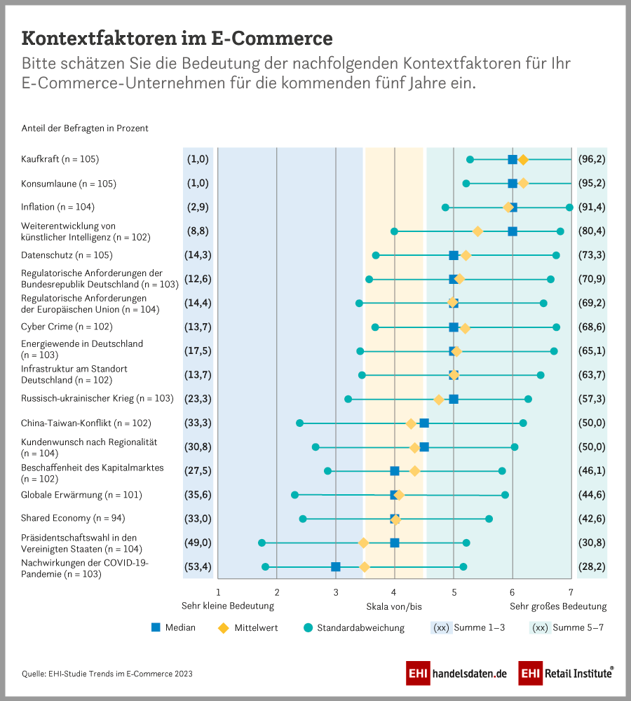 Bei der Frage nach den größten Einflussfaktoren auf den Onlinehandel in den kommenden fünf Jahren stehen Kaufkraft (96,2 Prozent), Konsumlaune (95,2 Prozent) und Inflation (91,3 Prozent) an erster Stelle. Dagegen spielen die Nachwirkungen der Corona-Pandemie nur noch für knapp 30 Prozent zukünftig eine Rolle.
