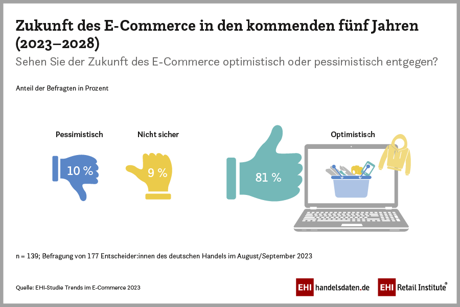 Der Blick in die Zukunft stimmt die Händler jedenfalls optimistisch. Über 81 Prozent blicken hoffnungsvoll auf die kommenden fünf Jahre. Für das laufende Jahr 2023 ist dagegen nur gut die Hälfte der Befragten positiv gestimmt. Zudem erwarten 91,9 Prozent, dass Umsätze im E-Commerce langfristig wachsen werden. 28,3 Prozent glauben sogar an ein starkes Umsatzwachstum in den nächsten Jahren.