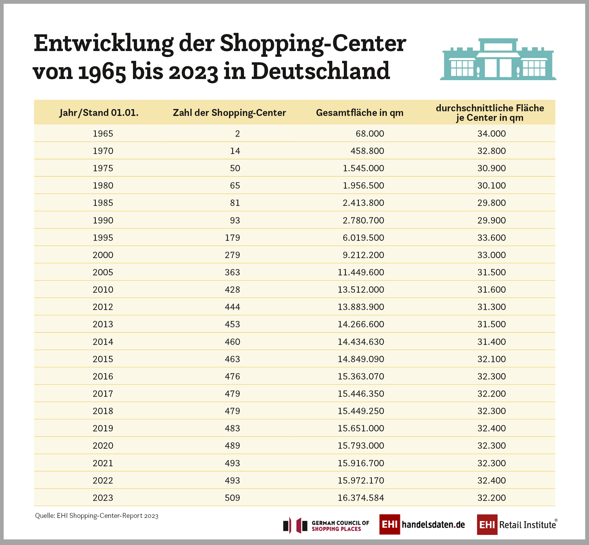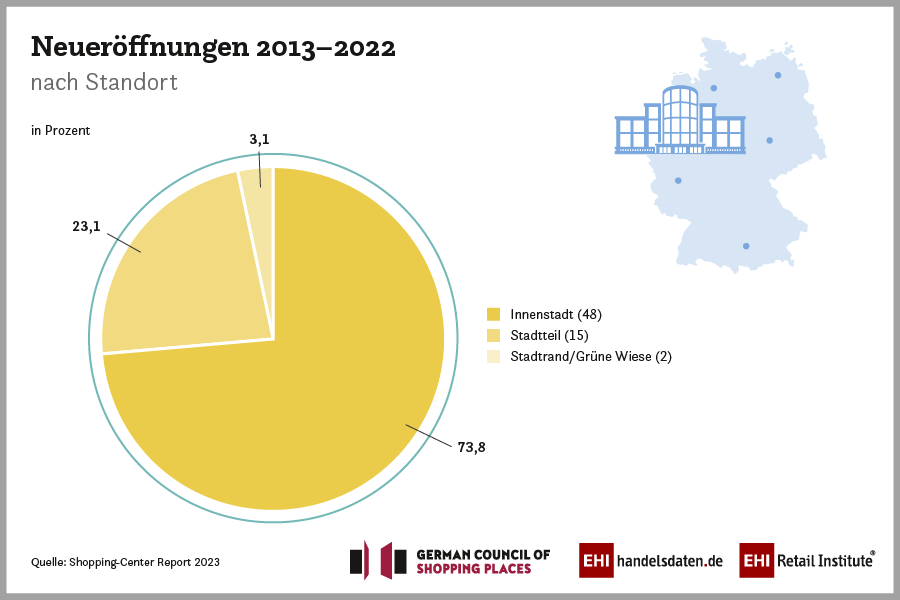 Die meisten Shopping-Center (47,5 Prozent) liegen in Innenstädten, gefolgt von Stadtteilen (37,5 Prozent) und dem Stadtrand/Grüne Wiese (14,9 Prozent). Die Center auf der Grünen Wiese und in den Stadtteilen hatten ihre Blütezeit vor allem in den 90er Jahren, als nach der Wende in Ostdeutschland in kurzer Zeit viele große Center entstanden. Seit den 2000er Jahren spielen diese Center jedoch kaum noch eine Rolle, da die Welle der Eröffnungen in die Innenstädte geschwappt ist. Diese hielt etwa bis zur Mitte der 2010er Jahre an und endete dann mit dem sich einstellenden Flächenüberangebot relativ abrupt. Seitdem wurden nur noch einzelne Neueröffnungen realisiert, die sich dann aber meist auf die Cities konzentrieren.
