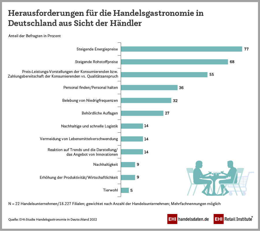 Die Erfolgsfaktoren in der Handelsgastronomie liegen den Händlern zufolge in den Bereichen Kundenorientierung, Prozessoptimierung und Produktqualität. Die Lage (82 Prozent), das gute Preis-Leistungs-Verhältnis (77 Prozent) sowie qualitativ hochwertige Zutaten, frische Produkte und die Nähe zur Kundschaft (je 68 Prozent) versprechen ihrer Ansicht nach den größten Erfolg. Allerdings steht die Branche weiterhin vor großen Herausforderungen. Steigende Energie- und Rohstoffpreise (77 bzw. 68 Prozent) stellen die größten Hürden dar. Sie tauchen vor dem Hintergrund der aktuellen Kriegssituation erstmalig im Ranking auf.