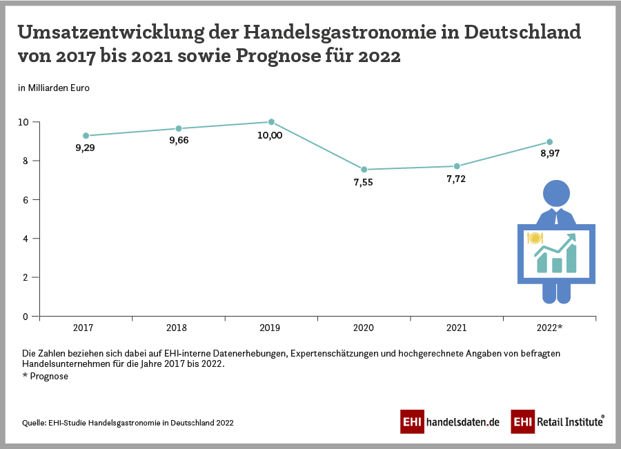 Die Umsatzzahlen in der Handelsgastronomie lassen einen deutlichen Aufwärtstrend erkennen, auch wenn die EHI-Prognose für 2022 nicht an das Vor-Corona-Jahr 2019 herankommt. Wurde im ersten Pandemie-Jahr 2020 noch ein Umsatz von 7,55 Mrd. Euro und damit 2,45 Mrd. Euro weniger als 2019 erzielt, erreichte der Umsatz im Jahr 2021 mit 7,72 Mrd. Euro ein leichtes Plus. Für 2022 sind die befragten Händler optimistisch gestimmt und rechnen mit einem Gesamtumsatz für die Handelsgastronomie von knapp neun Mrd. Euro.