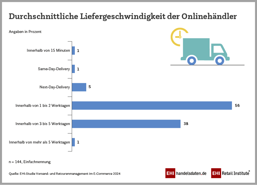 Im E-Commerce sind schlanke Prozesse essenziell. Eine schnelle Lieferung und ein optimales Retourenmanagement spielen aus Kundensicht eine zentrale Rolle und sind entscheidende Erfolgsfaktoren für Unternehmen. Aus der aktuellen EHI-Studie „Versand- und Retourenmanagement im E-Commerce 2024“ geht hervor, dass das Management von Lieferzeiten, Kosten sowie Retouren für die Onlinehändler ein Balanceakt darstellt. Die gesamten Ergebnisse der Studie Versand- und Retourenmanagement im E-Commerce 2024 werden auf der EHI Connect am 1. und 2.10. in Düsseldorf vorgestellt.