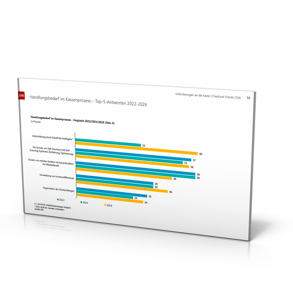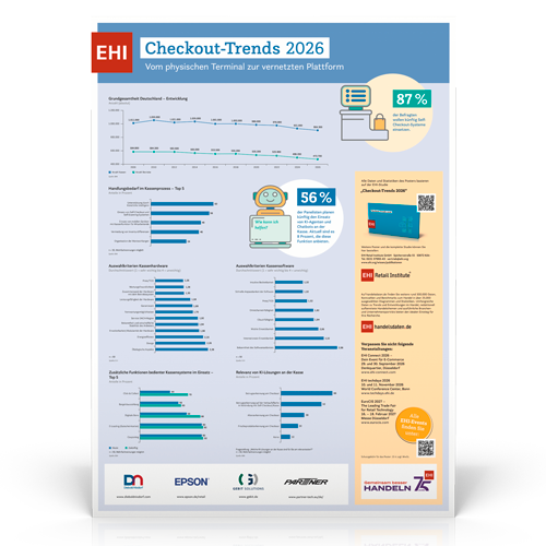 Seit 2006 führt das EHI Retail Institute alle zwei Jahre eine umfassende Studie zum Thema POS-Systeme und Checkout im deutschsprachigen Handel durch. Die Ergebnisse geben spannende Einblicke in die aktuellen Entwicklungen rund um den Checkout und die Investitionsschwerpunkte der IT-Verantwortlichen. In die elfte Ausgabe der Studie „Checkout-Trends 2026“ sind die Angaben von 50 Handelsunternehmen aus Deutschland, Österreich und der Schweiz mit einem Gesamtumsatz von 249,2 Milliarden Euro in der DACH-Region eingeflossen.
