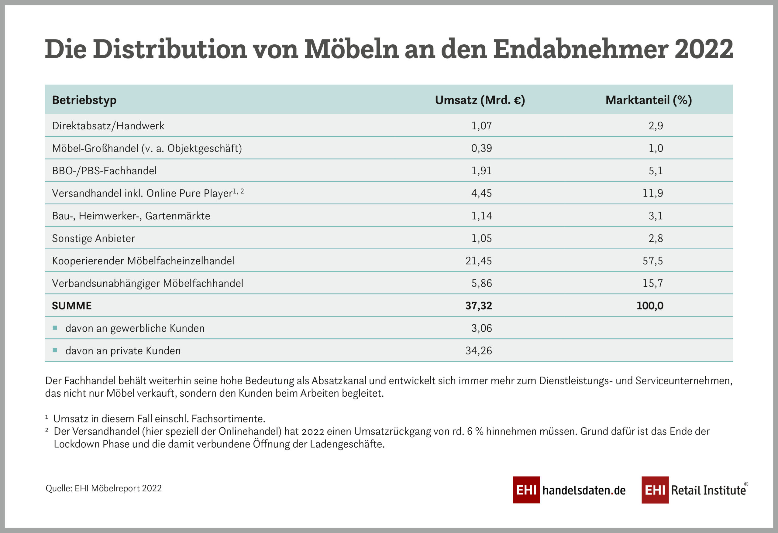 So lag der Gesamtumsatz mit Möbeln insgesamt bei 37,32 Mrd. Euro im Vergleich zu 35,93 Mrd. Euro in 2021. Davon entfallen 73,2 Prozent (27,31 Mrd. Euro) auf den stationären Möbelfachhandel. Im Vergleich zum Vorjahr bedeutet der Gesamtumsatz ein Zuwachs von 3,9 Prozent. Damit liegt der Möbelhandel unter dem Niveau des gesamten Einzelhandels, der laut Statistischem Bundesamt ein Plus von 7,8 Prozent verzeichnet, inflationsbereinigt aber 0,6 Prozent gegenüber 2021 verliert.