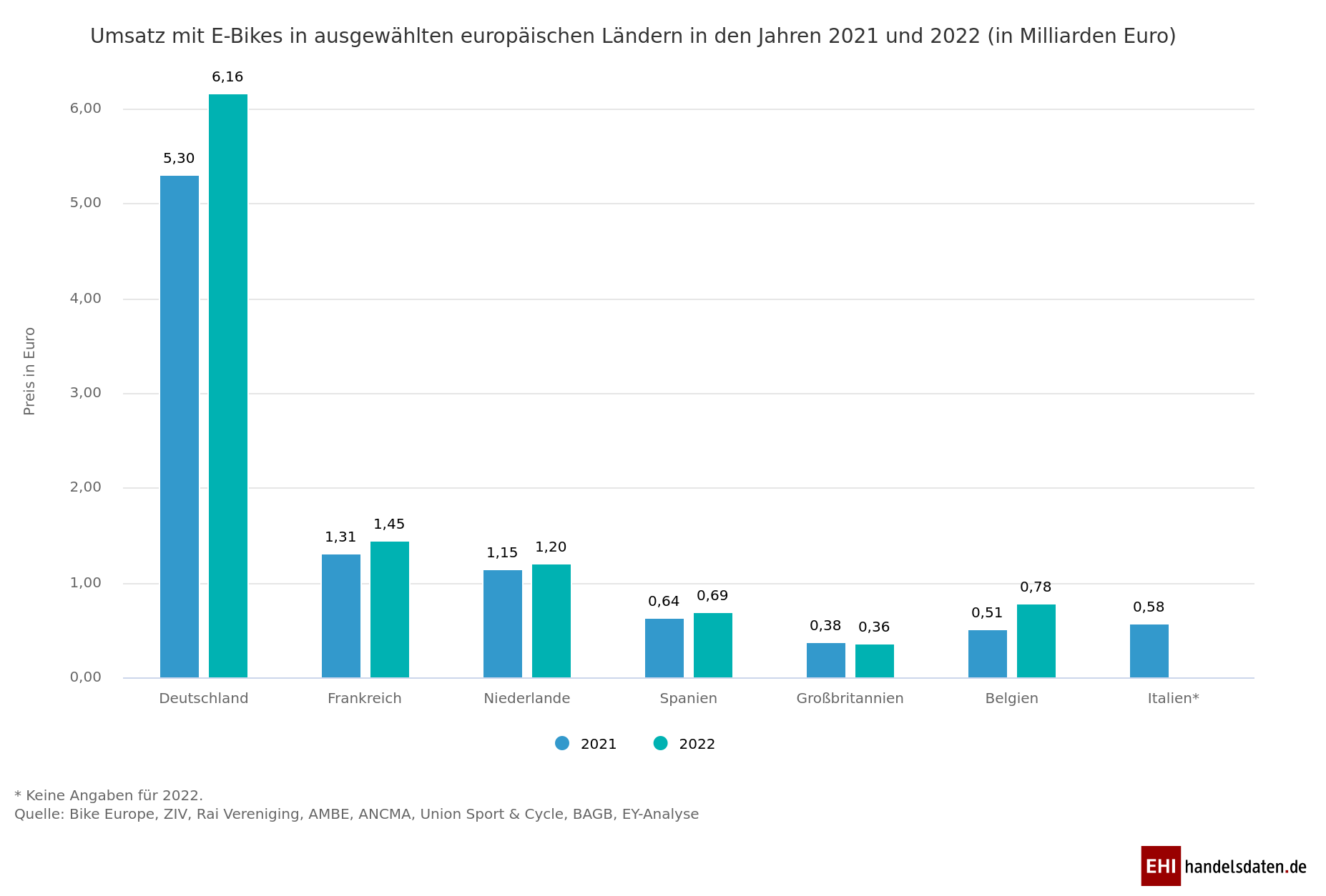 Europaweit machten E-Bikes 2022 rund 62 Prozent des Gesamtumsatzvolumens mit Fahrrädern aus, das entspricht 13,58 Milliarden Euro bei 5 Millionen verkauften E-Bikes. Fast die Hälfe des gesamteuropäischen Umsatzes mit elektrifizierten Rädern wurde im vergangenen Jahr in Deutschland erwirtschaftet. Der E-Bike-Umsatz lag hierzulande bei 6,16 Milliarden Euro und erhöhte sich damit um 16 Prozent gegenüber dem Vorjahr. Zweitgrößter Markt für E-Bikes in Europa ist Frankreich mit einem Umsatz von 1,45 Milliarden Euro (+11 Prozent), gefolgt von den Niederlanden mit 1,2 Milliarden Euro Umsatz (+4 Prozent).