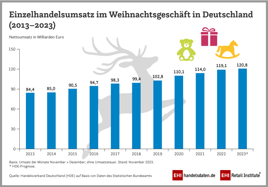 Wie wichtig das Weihnachtsgeschäft für den Handel ist, belegt eine Zahl: Durchschnittliche 19 Prozent des gesamten Einzelhandelsumsatzes im engeren Sinne wird in den Monaten November und Dezember erwirtschaftet. Das ist in etwa jeder fünfte Euro. Je nach Branche fällt die Bedeutung der Weihnachtsaison sogar noch größer aus. Spitzenreiter ist hier der Spielwareneinzelhandel, der im vergangenen Jahr 24,8 Prozent seiner Umsätze im Weihnachtsgeschäft erzielte. Auch der Buchhandel sowie der Uhren- und Schmuckfachhandel liegen mit Anteilen von 23,7 Prozent bzw. 23,5 Prozent weit vorne.