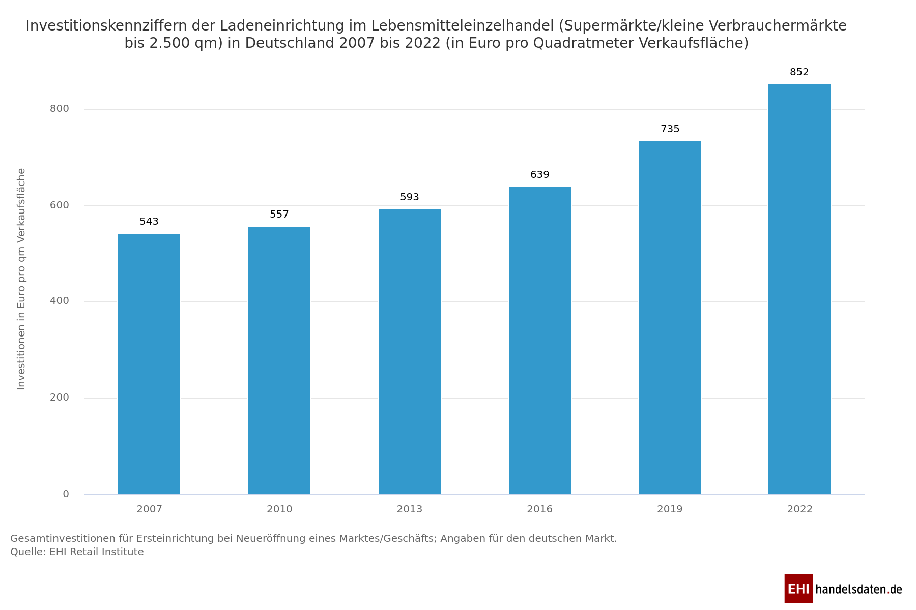 Die durchschnittlichen Einrichtungskosten für einen neuen Lebensmittelmarkt (bis 2500 qm) steigen kontinuierlich an. Wie die kostenfreie Infografik aus unserem EHI-Newsletter zeigt, beliefen sich im Jahr 2022 die Einrichtungsinvestitionen je Quadratmeter (qm) Verkaufsfläche (VKF) auf 852 Euro. Damit ist der Investitionsbedarf für ein neues Geschäft im Lebensmittelhandel im Vergleich zu 2019 deutlich gestiegen.