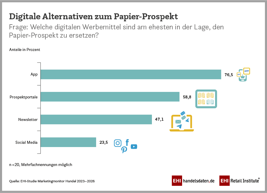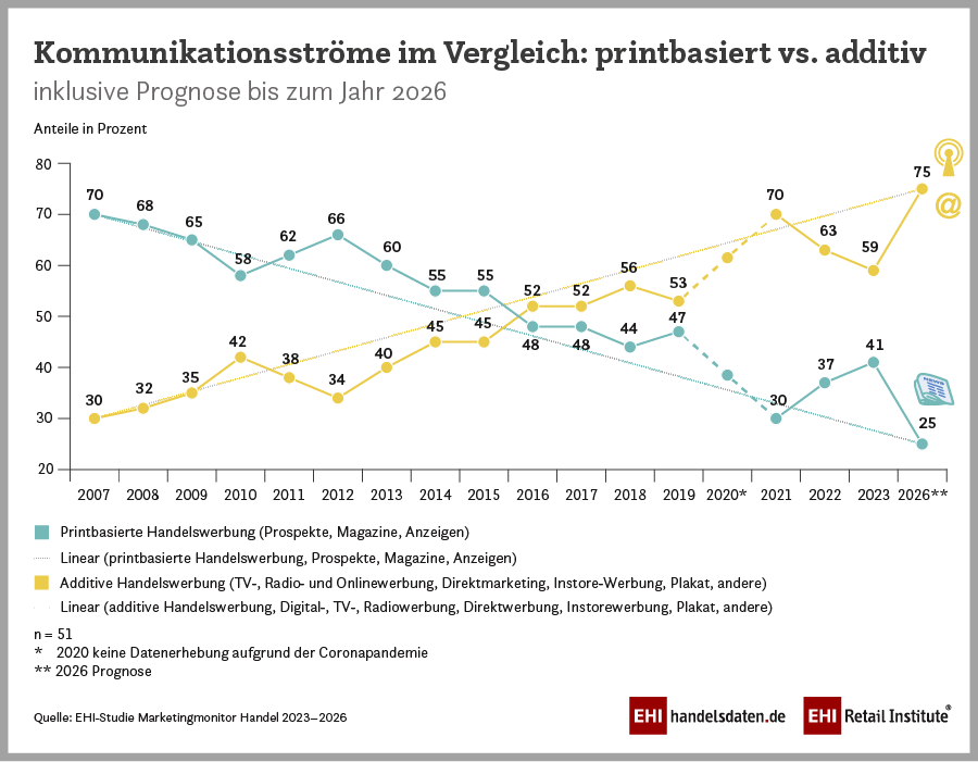 Corona hat der digitalen Werbung vorerst zu einer Hochphase verholfen, weil sich für Handelsunternehmen Planungsprozesse durch die volatilen Bedingungen wie Geschäftsschließungen oder gestörte Lieferketten sehr schwierig gestalteten. Deshalb haben sie die digitalen, flexibleren Medien bevorzugt. In 2022 haben globale Krisen und die Inflation in Deutschland dann dazu geführt, dass die Kundschaft mehr auf den Preis achtet. Einkäufe werden besser geplant, wozu wiederum der Prospekt zum Preisvergleich genutzt wird. „Die digitalen Medien wurden bislang zur Unterstützung von Printmedien genutzt. Aber in der Prognose für 2026 – da sind sich die Marketingverantwortlichen weitgehend einig – wird sich das Verhältnis umkehren und Print wird eher die digitalen Werbemaßnahmen ergänzen“, erklärt Marlene Lohmann, EHI-Marketingexpertin und Autorin der EHI-Studie Marketingmonitor 2023-2026.