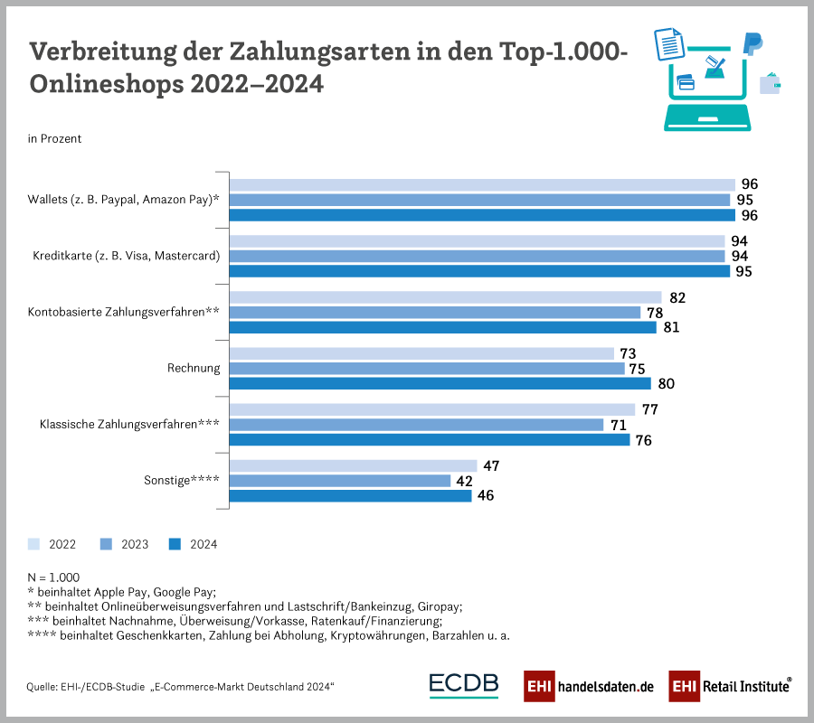 Die Studie „E-Commerce Markt Deutschland 2024“ von EHI und ECDB weist für Wallets in Onlineshops eine Akzeptanzquote von 96 Prozent aus, wobei 19 von 20 Händlern Paypal als Zahlungsart anbieten. Amazon Pay ist bei jedem vierten Onlinehändler nutzbar. Aber auch Apple Pay und Google Pay gewinnen, ausgehend von ihrem Erfolg im stationären Handel, im E-Commerce weiter an Bedeutung. So beabsichtigen nach der EHI-Studie „Online Payment 2024“ fast die Hälfte aller befragten Unternehmen (48,3 Prozent) eine Integration von Apple Pay und immerhin noch 37,9 Prozent von Google Pay innerhalb der nächsten Monate. Die befragten Unternehmen sehen Paypal, Apple und Google unter den Top-Akteuren bei der Entwicklung des Online-Payments – noch vor den Kreditkartenunternehmen und der Deutschen Kreditwirtschaft.