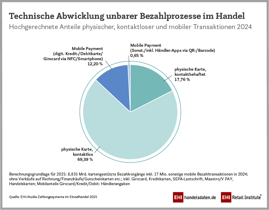 Innerhalb der Kartenzahlungen bleibt die Girocard – trotz eines Rückgangs von 0,9 Prozentpunkten – mit 41,5 Prozent Marktführer im stationären Einzelhandel. Internationale Debitkarten (Visa Debit, Debit Mastercard) verzeichnen ein signifikant starkes Wachstum von 2,8 Prozentpunkten auf nun 6,9 Prozent Umsatzanteil; Kreditkarten müssen ein leichtes Minus von 0,3 Prozentpunkten hinnehmen und landen bei 8,3 Prozent. Sepa-Lastschrift bringt es auf 6,2 Prozent.